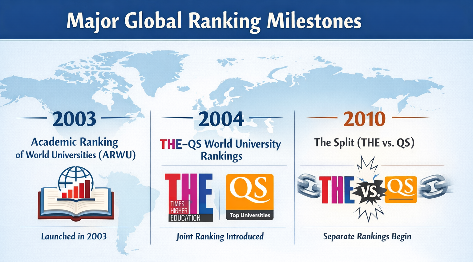 • Times Higher Education World University Rankings: Introduced a revised methodology in collaboration with Thomson Reuters (and later Elsevier), incorporating broader performance indicators.